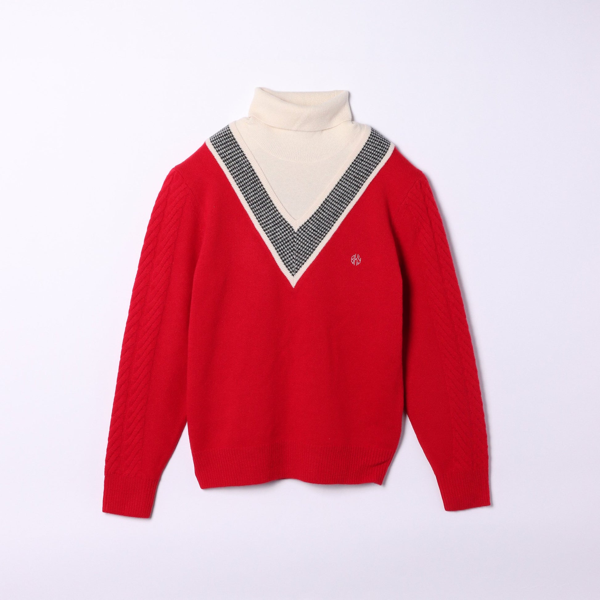 クリケットセーターとタートルニットを組み合わせたデザイン。Vネック部分の千鳥柄がワンポイントで、1枚でも様になります。
