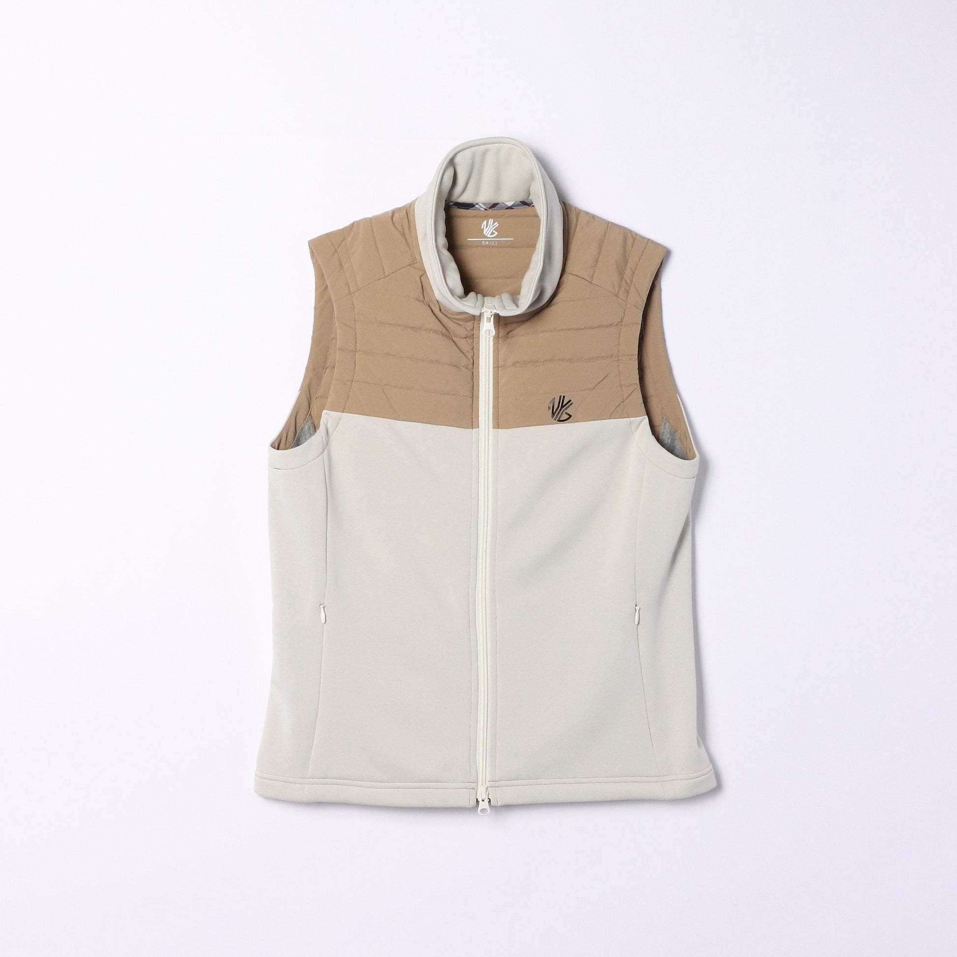 切り替えデザインが目を惹くベスト。ファスナーにはダブルオープンファスナーを採用。下のスライダーを開けることで、お腹まわりのダブつきを左右に逃がすことができ、スイングやしゃがみ姿勢の際にも邪魔になりません。裏地なし。